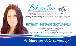 Ονομάζομαι Πετρίδου-Τουτουντζίδου Ανθούλα και είμαι εκπαιδευτικός. Θα ήθελα να σας γνωστοποιήσω ότι στις Δημοτικές Εκλογές του Μαΐου θα.