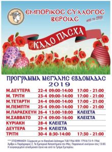 Με πασχαλινό ωράριο θα λειτουργούν από την Μεγάλη Δευτέρα 22 Απριλίου τα εμπορικά καταστήματα της Βέροιας , σύμφωνα με ανακοίνωση του…