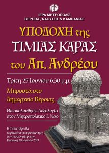 Την Τρίτη 25 Ιουνίου στις 6:30 μ.μ. μπροστά από το Δημαρχείο της Βέροιας θα πραγματοποιηθεί η Υποδοχή της Τιμίας Κάρας του Αποστόλου Ανδρέου…