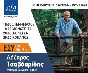 Ο υποψήφιος βουλευτής της Νέας Δημοκρατίας, Λάζαρος Τσαβδαρίδης, θα επισκεφθεί σήμερα 25 Ιουνίου τις παρακάτω περιοχές:Στις 19:00 την…
