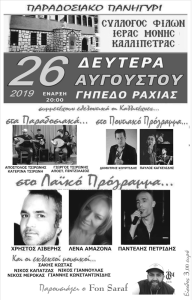 Τη Δευτέρα 26/8/2019 στις 20:00 διοργανώνεται παραδοσιακό γλέντι στο γήπεδο της Ραχιάς. Συμμετέχουν 20 καλλιτέχνες οι οποίοι θα τραγουδήσουν…