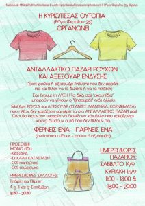 Ανταλλακτικό παζάρι ρούχων και αξεσουάρ ένδυσης θα πραγματοποιηθεί στον Χώρο “Κυριώτισσας Ουτοπία”, στην οδό Ρήγα Φεραίου 25.Ημέρες και…