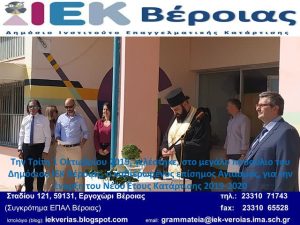 1 Οκτωβρίου 2019, τελέστηκε, στο μεγάλο προαύλιο του Δημόσιου ΙΕΚ Βέροιας, ο καθιερωμένος επίσημος Αγιασμός, για την έναρξη του Νέου