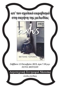Η Λογοτεχνική Συντροφιά Νάουσας θα παρουσιάσει το βιβλίο ΑΧΛΥΣ του ΒΑΓΓΕΛΗ ΤΣΙΡΩΝΗ το Σάββατο, 12 Οκτωβρίου 2019 και ώρα 7:30μμ, στην αίθουσα…