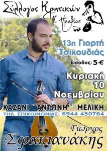 Την Κυριακή 10 Νοεμβρίου 2019 ο Σύλλογος Κρητικών Ημαθίας διοργανώνει την 13η Γιορτή Τσικουδιάς στο καζάνι του “Αντώνη” στη Μελίκη Ημαθίας με..