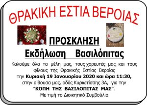Η Θρακική Εστία Βέροιας σας προσκαλεί στην κοπή της Βασιλόπιτας που θα πραγματοποιηθεί την Κυριακή 19 Ιανουαρίου 2020 στις 11:30 στην αίθουσα.