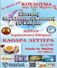 Η Τοπική Κοινότητα Αγίας Μαρίνας θα διοργανώσει την Καθαρά Δευτέρα 2 Μαρτίου 2020 από της 10:00 το πρωί στο γήπεδο του χωριού τα «Κούλουμα 2020».