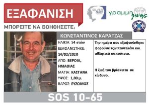 Ο 54χρονος Κωνσταντίνος Καρατζάς από τη Βέροια αγνοείται από την Παρασκευή 14 Φεβρουαρίου 2020.Ο Κωνσταντίνος Καρατζάς έχει καστανιά μάτια,…