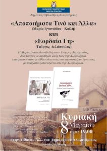 Το Κοινωνικό Πανεπιστήμιο Ενεργών Πολιτών σε συνεργασία με τη Δημοτική Βιβλιοθήκη Αλεξάνδρειας παρουσιάζουν δύο ποιητικές συλλογές…