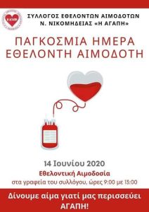 Ο Σύλλογο Εθελοντών Αιμοδοτών Ν. Νικομήδειας σας προσκαλεί στην τακτική Αιμοδοσια του συλλόγου που θα γίνει την Κυριακή 14/6 στα γραφεία του.