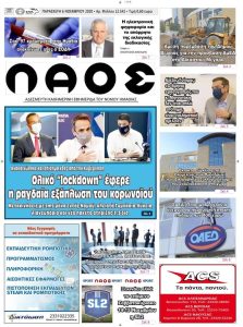 Πρωτοσέλιδο 6/11/20 Εφημερίδα ΛΑΟΣ Ολικό LockDown έφερε η ραγδαία εξάπλωση του κορονοϊούΣοκ: 97 κρούσματα στην Ημαθία ανακοίνωσε χθες ο ΕΟΔΥΗ.