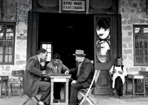 ξύλινες καρέκλες µε ψαθί και δερμάτινοι καναπέδες κολλητά στους τοίχους. Στη…