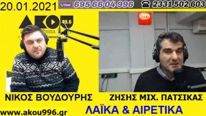 99,6 «Λαϊκά και Αιρετικά» της Τρίτης 19 Ιανουαρίου 2021, με τους Ζήση Μιχ. Πατσίκα και Νίκο Βουδούρη:- Στη Βουλή η…