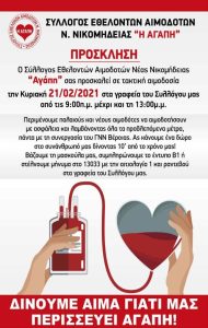 Ο Σύλλογος Εθελοντών Αιμοδοτών Νέας Νικομήδειας « Η ΑΓΑΠΗ» καλεί τα μέλη του στην πρώτη τακτική αιμοδοσία για το 2021. Την Κυριακή 21…