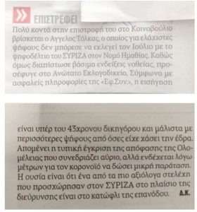 Σε δημοσίευμα της στήλης «Πολιτικά Παρασκήνια» της Εφημερίδας των Συντακτών σχετικά με το εκλογικό αποτέλεσμα στην Ημαθία για το…