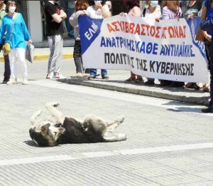 Σε κατάσταση κινητοποίησης διαμαρτυρίας και ο σκύλος της πλατείας Δημαρχείου ο οποίος ξάπλωσε μπροστά στο πανό των διαδηλωτών…