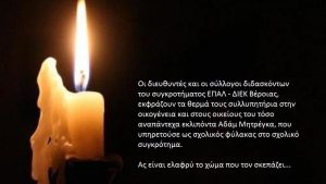 Οι διευθυντές και οι σύλλογοι διδασκόντων του συγκροτήματος ΕΠΑΛ – ΔΙΕΚ Βέροιας, εκφράζουν τα θερμά τους συλλυπητήρια στην οικογένεια και..