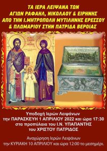 Τα λείψανα των Αγ. Ραφαήλ, Νικολάου και Ειρήνης στην Πατρίδα Βέροιας (Από 1/4 έως 10/4/2022)
