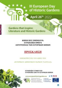 Το Δημοτικό Πάρκο Νάουσας στους Ιστορικούς Κήπους της E.E. – Ευρωπαϊκή Ημέρα Λογοτεχνίας των Ιστορικών Κήπων (Τρίτη 26.04.2022)Ο Δήμος Η.Π. Νάουσας