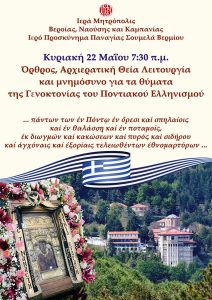 Ἡ Ἱερά Μητρόπολις Βεροίας, Ναούσης καί Καμπανίας, καλεῖ ἅπαντα τόν εὐσεβῆ λαό τῆς Μητροπόλεώς μας, τήν Κυριακή 22 Μαΐου στό Ἱερό…