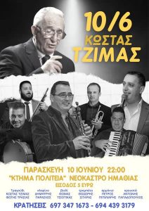 Την Παρασκευή, 10 Ιουνίου, στις 10 το βράδυ, στο “Κτήμα ΠΟΛΙΤΕΙΑ” στο Νεόκαστρο Ημαθίας.Ο δημοτικός τραγουδιστής από την Ήπειρο, ο κορυφαίος…