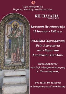 Την Κυριακή της Πεντηκοστής 12 Ιουνίου θα τελεστεί υπαίθρια Αρχιερατική Θεία Λειτουργία στο «Βήμα του Αποστόλου Παύλου» προεξάρχοντος του.