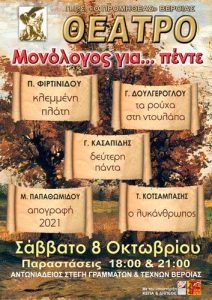 Ο Π.Γ.Σ. “Ο ΠΡΟΜΗΘΕΑΣ” Βέροιας παρουσιάζει τη θεατρική παράσταση “Μονόλογος για…πέντε” το Σάββατο 8 Οκτωβρίου στη Στέγη Γραμμάτων και…