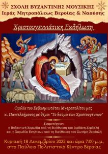 Η Σχολή Βυζαντινής Μουσικής της Ιεράς Μητροπόλεως Βεροίας, Ναούσης και Καμπανίας διοργανώνει Χριστουγεννιάτικη Εκδήλωση, στο Παύλειο…