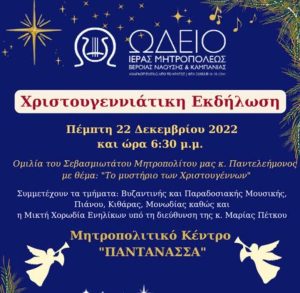 Η Ιερά Μητρόπολις Βεροίας, Ναούσης και Καμπανίας σας προσκαλεί στην Χριστουγεννιάτικη Εκδήλωση του Ωδείου της Ιεράς Μητροπόλεως μας, η…
