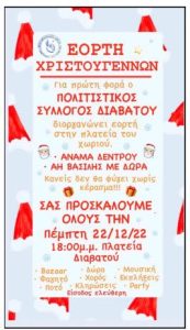 Ο Μορφωτικός Πολιτιστικός Σύλλογος Διαβατού στο πλαίσιο των εορταστικών εκδηλώσεων των Χριστουγέννων, διοργανώνει την Πέμπτη 22…