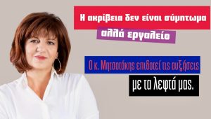 Με αφορμή την άρνηση της κυβέρνησης να μειώσει τον ΦΠΑ στα τρόφιμα, η πρώην βουλευτής Φρόσω Καρασαρλίδου έκανε την εξής δήλωση:«Η ακρίβεια..