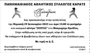 Την Κυριακή 29 Ιανουαρίου 2023 στις 13:00 μ.μ. στο κοσμικό κέντρο “ΣΕΙΡΙΟΣ”, στο Μακροχώρι ο Πανημαθιακός αθλητικός Σύλλογος ΚΑΡΑΤΕ σας…