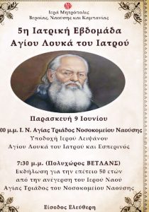 Στο πλαίσιο της «5ης Ιατρικής Εβδομάδος του Αγίου Λουκά του Ιατρού» που διοργανώνει η Ιερά Μητρόπολη, θα πραγματοποιηθεί σήμερα Παρασκευή