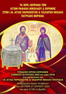 Το Σάββατο 22 Ιουλίου 2023, στις 19:00, στα προπύλαια του Ι.Ν. Αγ. Παρασκευής & Ταξιάρχη Μιχαήλ στην Πατρίδα Δ. Βέροιας, θα πραγματοποιηθεί η…