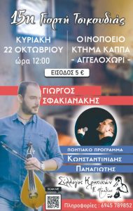 Ο Σύλλογος Κρητικών Νομού Ημαθίας σας προσκαλεί την Κυριακή 22 Οκτωβρίου και ώρα 12.00, στην 15η Γιορτή Τσικουδιάς, που διοργανώνει στο…