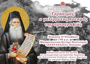 Την Κυριακή 19 Νοεμβρίου στις 7:00 μ.μ. στη Νάουσα η εκδήλωση «Γεράσιμος, ο μελίρρυτος ποταμός της υμνογραφίας».