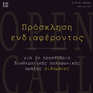 Χρόνος διεξαγωγής εργαστηρίου: 9-11/02/2024Το ΔΗ.ΠΕ.ΘΕ. Βέροιας και η Δήμητρα Τρυπάνη προβαίνoυν σε πρόσκληση ενδιαφέροντος για την επιλογή…