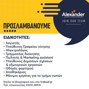 Η ομάδα της ΑΛΕΞΑΝΤΕΡ Α.Ε., με έδρα στην Βέροια, μεγαλώνει και ανακοινώνουμε το άνοιγμα 9 νέων θέσεων εργασίας.1. Λογιστής (κωδικός θέσης…