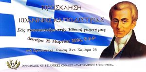 Σας προσκαλούμε στην Εθνική γιορτή μας την Δευτέρα 25 Μαρτίου 2024, στις 6.00 μ.μ. στην Χριστιανική Ένωση, Αντ, Καμάρα 25.