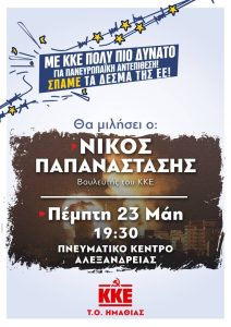 Προεκλογική συγκέντρωση θα πραγματοποιήσει το ΚΚΕ στην Αλεξάνδρεια, στο Πνευματικό Κέντρο, την Πέμπτη 23 Μαΐου στις 7.30 μ.μ.. Ομιλητής θα…