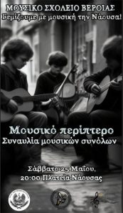 Τα παιδιά του μουσικού σχολείου Βέροιας θα μεταφέρουν το Σάββατο, 25 Μαΐου 2024 στις 8.00 μ.μ., το μουσικό τους περίπτερο στη Νάουσα και θα…