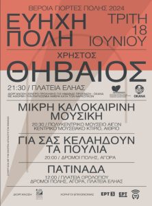 18 – 21 Ιουνίου απο την ΚΕΠΑ Δήμου Βέροιας «Βέροια – Εύηχη Πόλη 2024»: Μια μεγάλη μουσική γιορτή με ελεύθερη είσοδο -Έναρξη Τρίτη 18/6 με πατινάδα, καντάδες, μουσική δωματίου και Χρήστο Θηβαίο