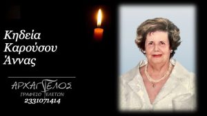 Έφυγε από τη ζωή και κηδεύεται την Κυριακή 30 Ιουνίου 2024 στις 12.00 μ.μ. από τον Ιερό Ναό Αγίου Αθανασίου (Κοιμητήρια) Βέροιας η Άννα Καρούσου σε.