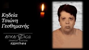 Έφυγε από τη ζωή και κηδεύεται το Σάββατο 13 Ιουλίου 2024 στις 10.30 π.μ. από τον Ιερό Ναό Αγίου Αθανασίου (Κοιμητήρια) Βέροιας η Γεσθημανή (Γεύσω)..
