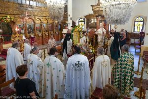 Το πρωί της Δευτέρας, 19ης Αυγούστου, στον πανηγυρίζοντα Ιερό Ναό Κοιμήσεως της Θεοτόκου Ναούσης τελέστηκε Αρχιερατική θεία Λειτουργία για.