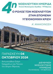 Η Διεύθυνση Νοσηλευτικής Υπηρεσίας του Γενικού Νοσοκομείου Ημαθίας – Υ.Μ. Βέροιας, διοργανώνει την 4η Νοσηλευτική Ημερίδα με θέμα: Ο ΡΟΛΟΣ..