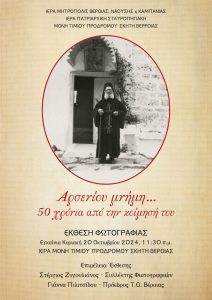 Την Έκθεση Φωτογραφίας με τίτλο “Αρσενίου μνήμη… 50 χρόνια από την κοίμησή του”, θα εγκαινιάσει την Κυριακή 20 Οκτωβρίου 2024 και ώρα 11:30 π.μ. ο..