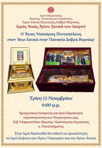 Την Τρίτη 12 Νοεμβρίου στις 6:00 μ.μ. στον Ιερό Ναό του Αγίου Λουκά του Ιατρού στην Ιερά Μονή Παναγίας Δοβρά Βεροίας θα τελεστεί, όπως κάθε…