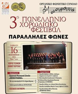 Το Οργανικό Φωνητικό Σύνολο «Μονόγραμμα» διοργανώνει και παρουσιάζει το 3ο Πανελλήνιο Φεστιβάλ χορωδιών “ΠΑΡΑΛΛΗΛΕΣ ΦΩΝΕΣ”, το Σάββατο 16