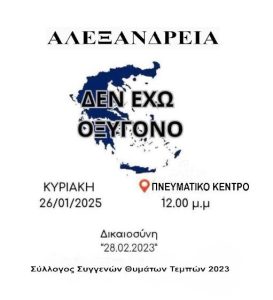 Την Κυριακή 26 Ιανουαρίου 2025 και ώρα 12:00, στο Πνευματικό Κέντρο της Αλεξάνδρειας, συμμετέχουμε στο κάλεσμα του Συλλόγου Συγγενών Θυμάτων των